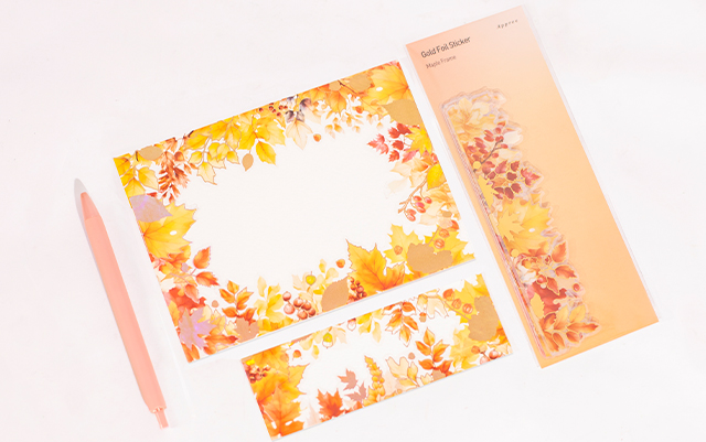 The maple frame sticker, which becomes even more captivating when the autumn maple forest meets the gold foil, reveals its delicate details as you draw closer. By incorporating luxurious gold foil accents into the outlines of the leaves and the contours of the plants, we have enhanced its sparkling beauty.